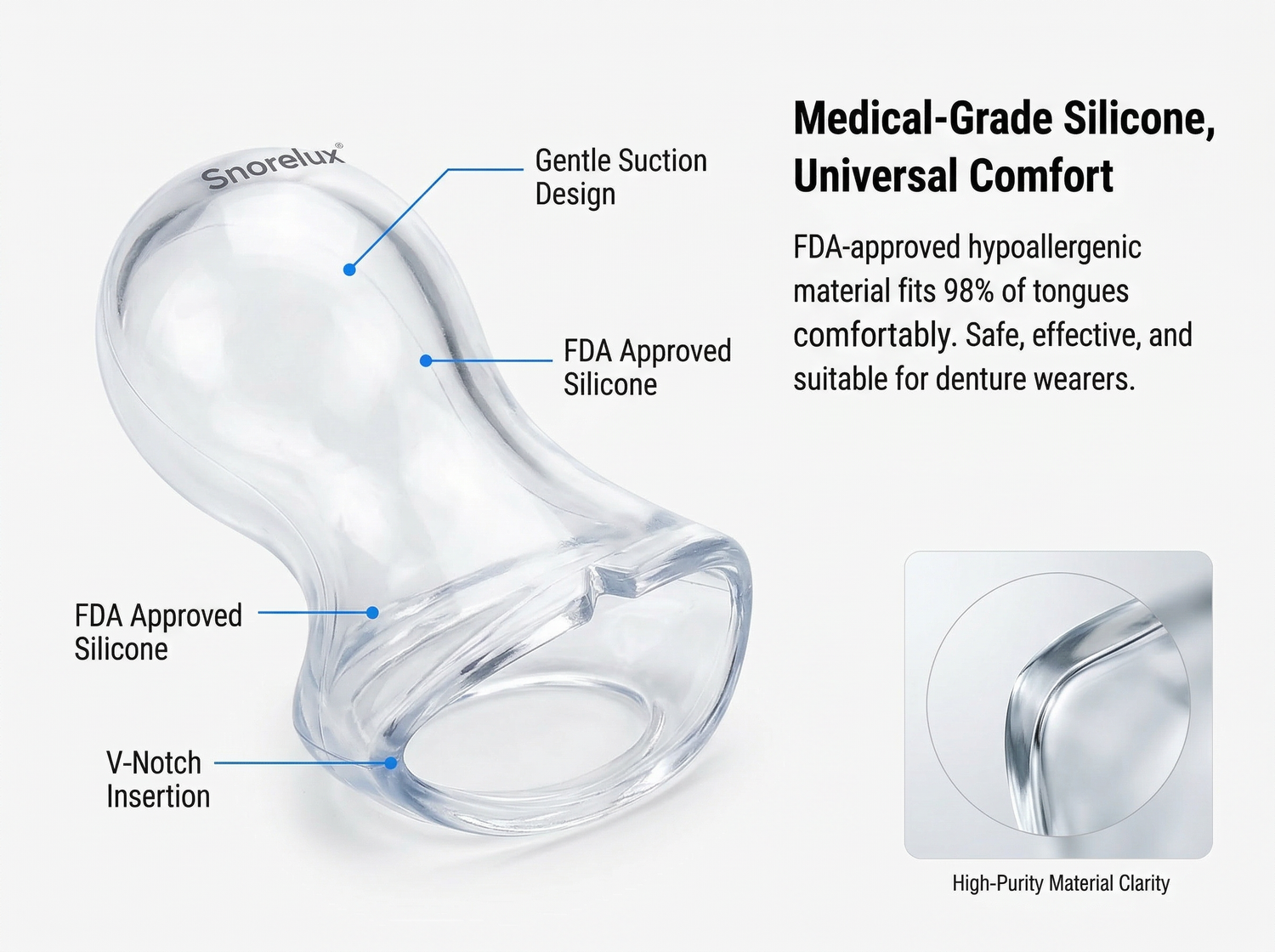 This device is effective for tongue-based snoring, which accounts for most snoring cases. If your tongue falls back during sleep and blocks your airway, this solution will work for you. Suitable for all ages and safe for denture wearers.