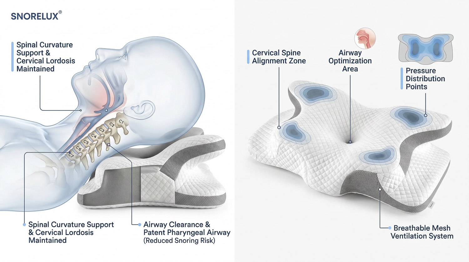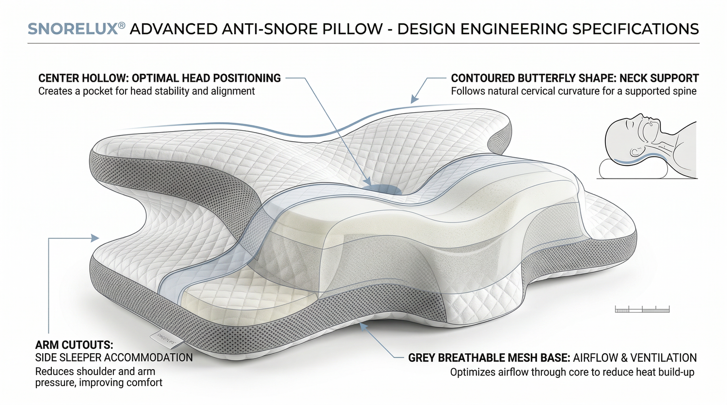 Traditional pillows force your head back, collapsing your airway and causing snoring. Our advanced butterfly design keeps your head elevated at the optimal angle, opening your airway naturally for silent, uninterrupted breathing all night long.